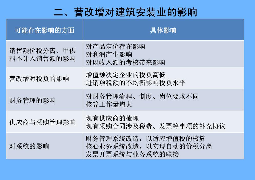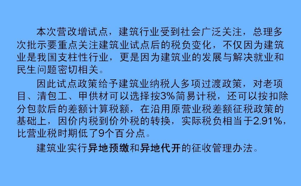 建筑業(yè)是我國(guó)支柱性產(chǎn)業(yè),建筑業(yè)的發(fā)展與解決就業(yè)和民生問題密切相關(guān),建筑行業(yè)“營(yíng)改增”對(duì)于建筑業(yè)公司的發(fā)展至關(guān)重要,通過此次專題講座,使我司員工能熟知“營(yíng)改增”的各項(xiàng)政策,避免工作中因增值稅發(fā)票的開據(jù)、管理等帶來一系列不必要的損失。