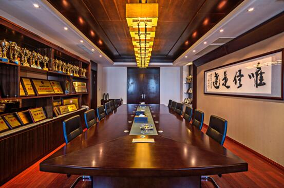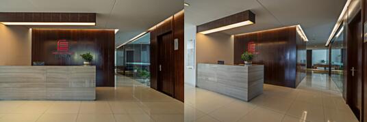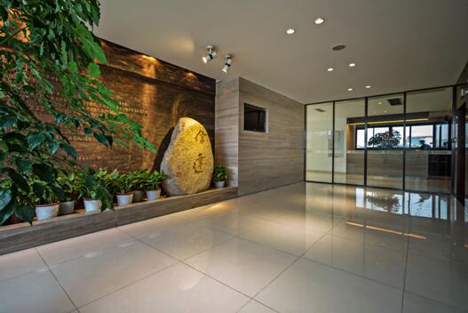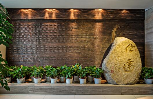 定制的背景, 以古銅色調(diào)呈現(xiàn), 企業(yè)的發(fā)展在此一 一敘述, 著名書法家徐安碧題的信達(dá), 剛勁, 有力, 寓意深厚, 淺色石材與背景形成了色調(diào)上的對(duì)比。電梯廳造型簡(jiǎn)潔, 構(gòu)圖適當(dāng), 透明的電動(dòng)移門將前臺(tái)接待與電梯廳連在了一起, 相互映照。