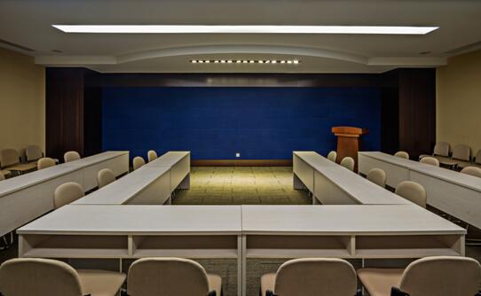 深藍(lán)色背景加強(qiáng)了空間的質(zhì)感, 對(duì)稱布置的桌椅, 平衡了空間的秩序。